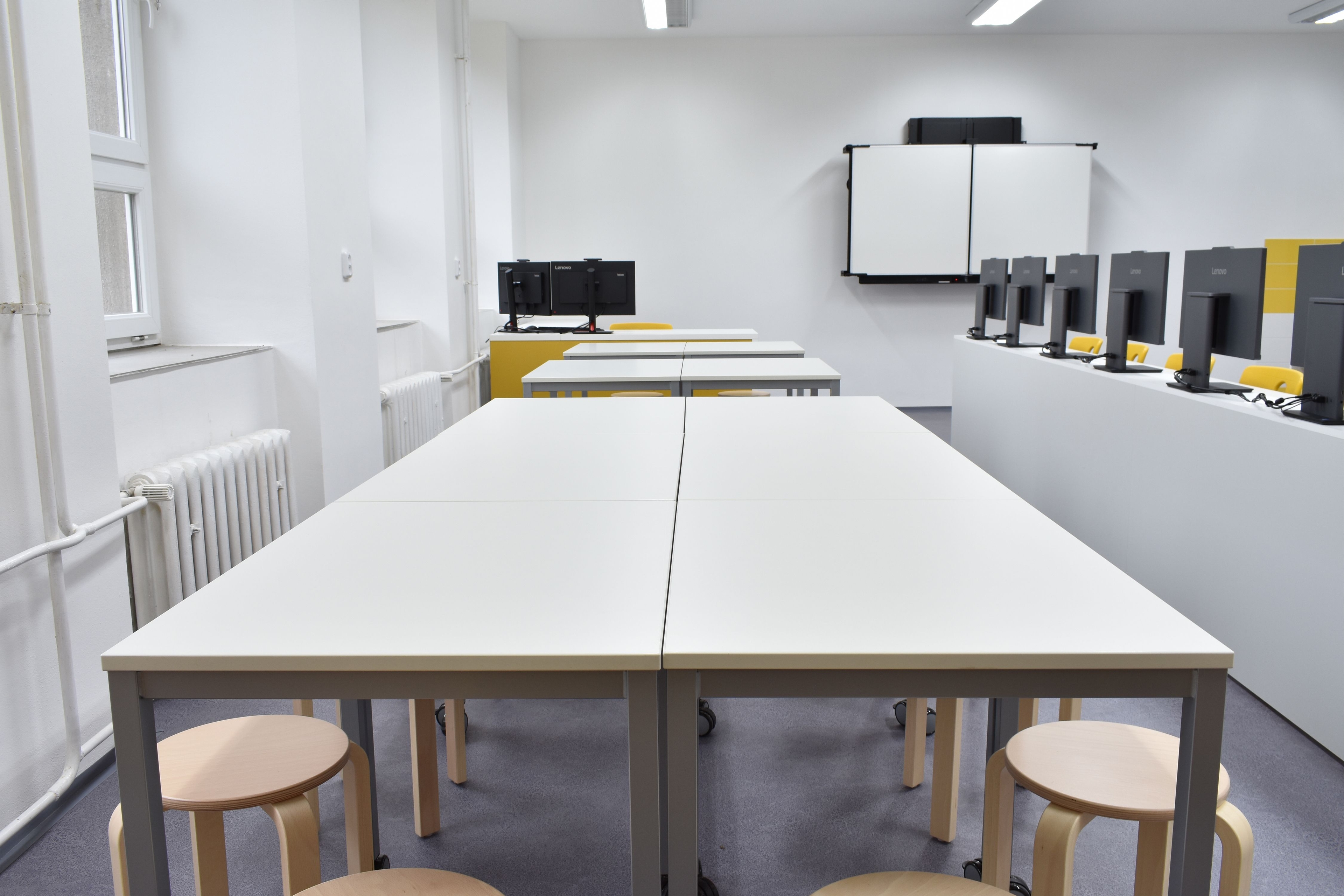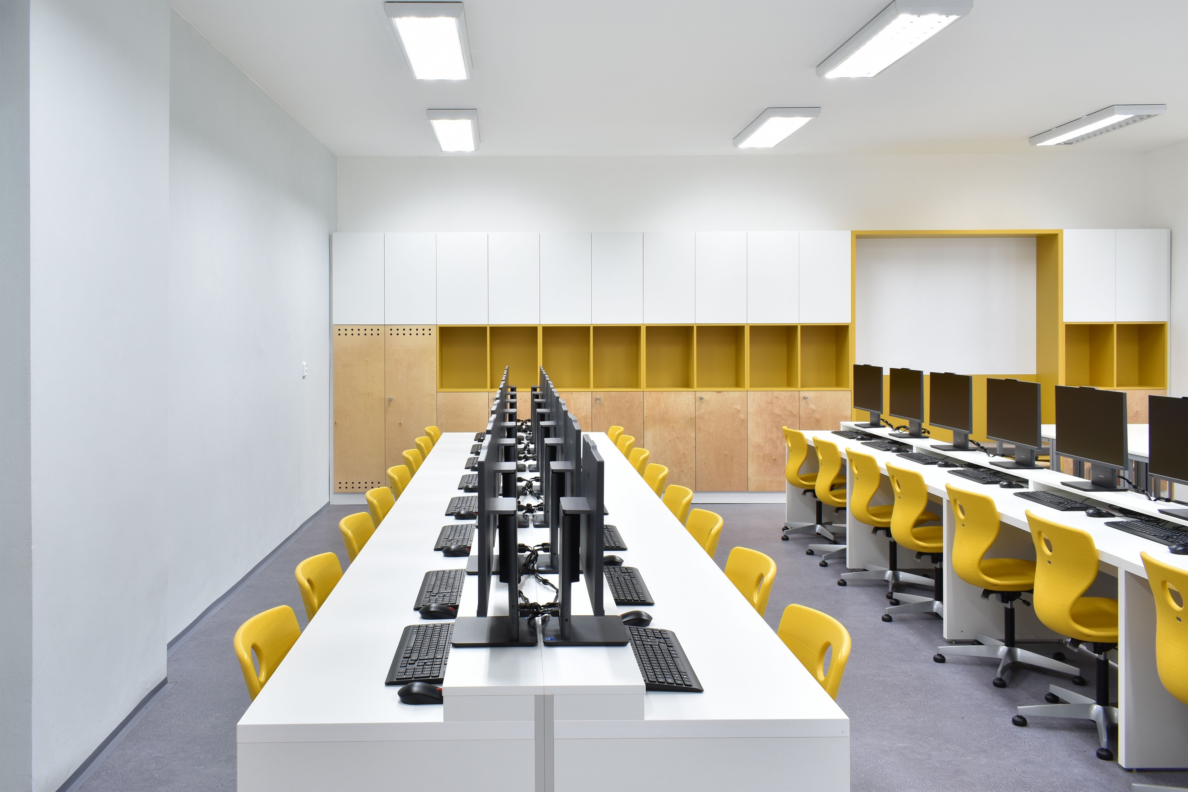 Učebna je koncipována jako moderní multimediální prostor, který umožňuje flexibilní využití při výuce digitálních a informatických kompetencí. Je rozdělena na dvě hlavní části. První, statická část, je vybavena 24 pracovními místy s PC stoly, které poskytují žákům komfortní zázemí pro práci s digitálními technologiemi. Druhá část je určena pro výuku robotiky a je vybavena mobilními stoly, jež lze snadno přeskupovat a přizpůsobovat aktuálním potřebám výuky, skupinové práci nebo projektovým aktivitám.
