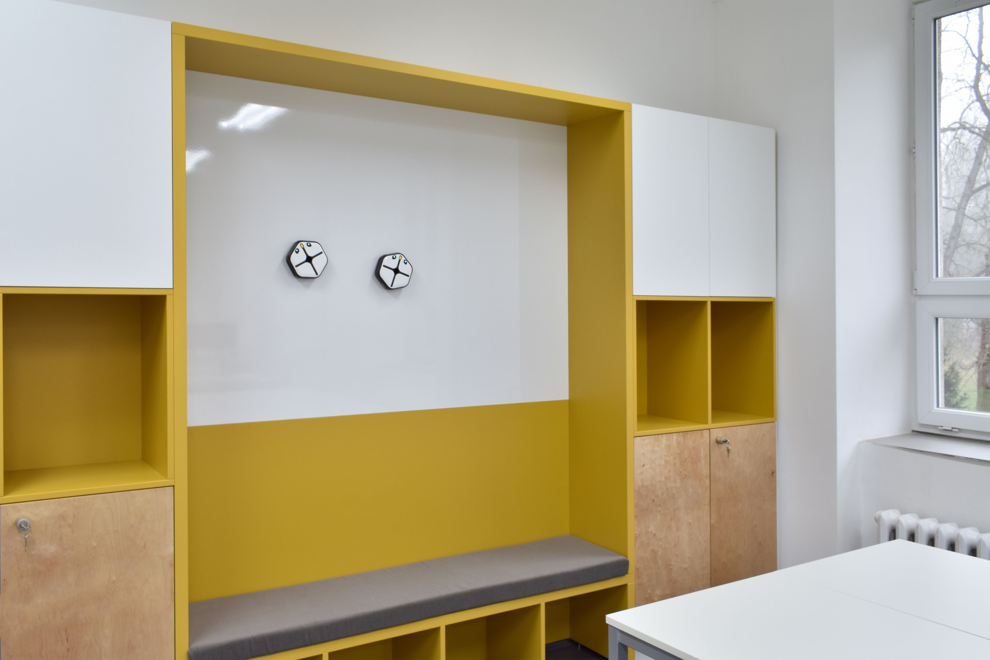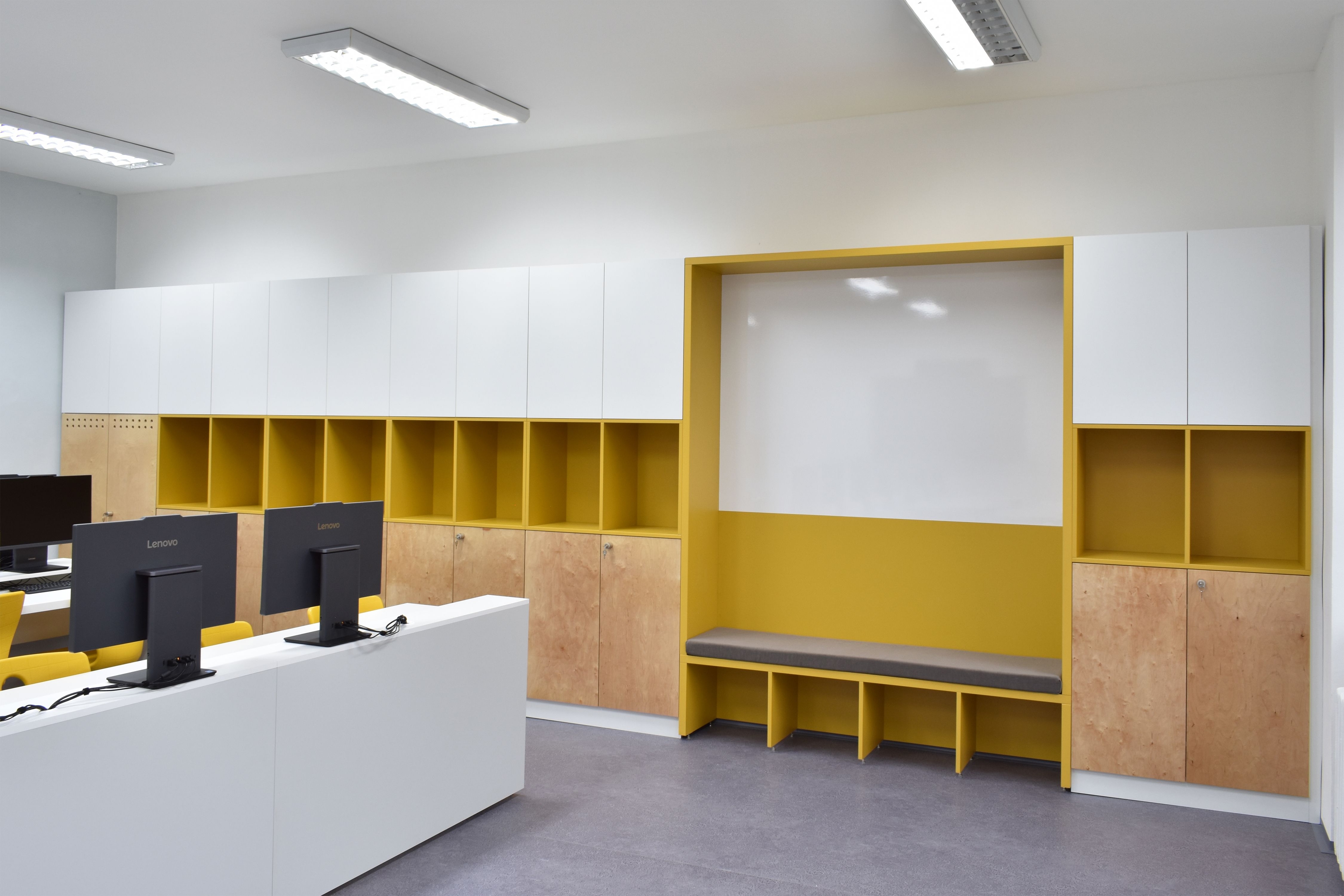 Na zadní stěně učebny se nachází rozměrná úložná skříň, která slouží nejen k bezpečnému uložení technického vybavení, ale také k jeho dobíjení, což přispívá k lepší organizaci a efektivnímu provozu učebny. Součástí prostoru je rovněž relaxační koutek s pohodlným čalouněným sedákem, který mohou žáci využívat k odpočinku, čtení nebo neformální práci. Otevřené police v této části zároveň plní funkci knihovny a nabízejí prostor pro odbornou literaturu.