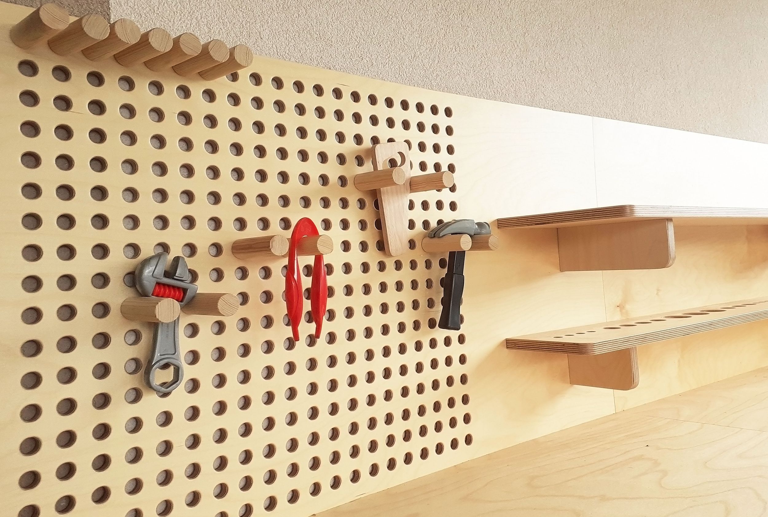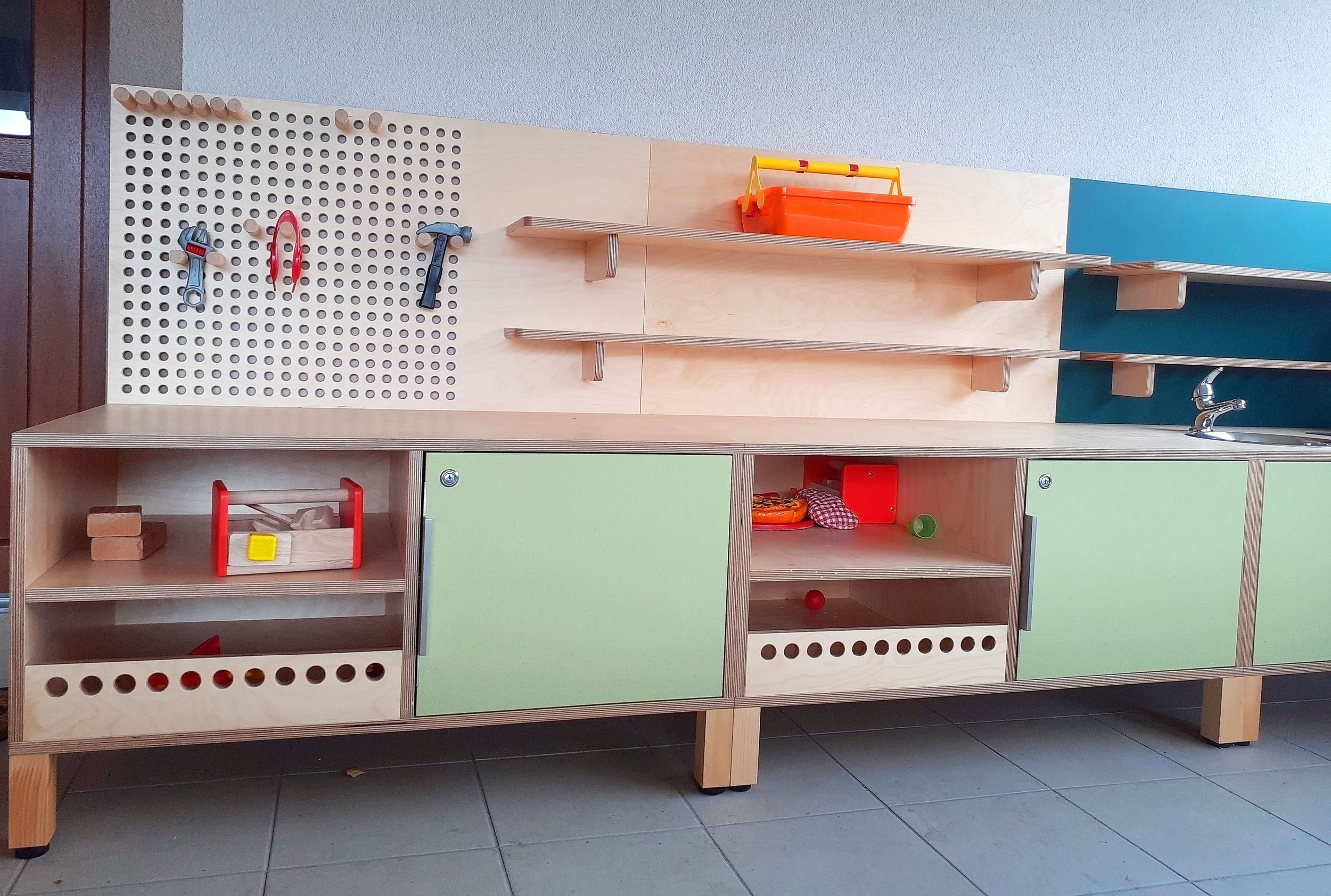 Dominantou prostoru je pult, který nabízí hned několik interaktivních prvků. Na jedné straně je dílenský stůl, kde si děti mohou hrát s různorodým nářadím – od šroubováků, kladívek až po kleště, což jim umožňuje rozvíjet manuální dovednosti a kreativitu. Na druhé straně se nachází kuchyňka vybavená dřezem a plotýnkou, kde děti mohou napodobovat vaření, hrát si na kuchaře nebo se učit základům péče o domácnost. Tento víceúčelový kus nábytku rozšiřuje možnosti hry a vzdělávání, ať už jde o jemnou motoriku nebo sociální dovednosti při spolupráci s ostatními dětmi.