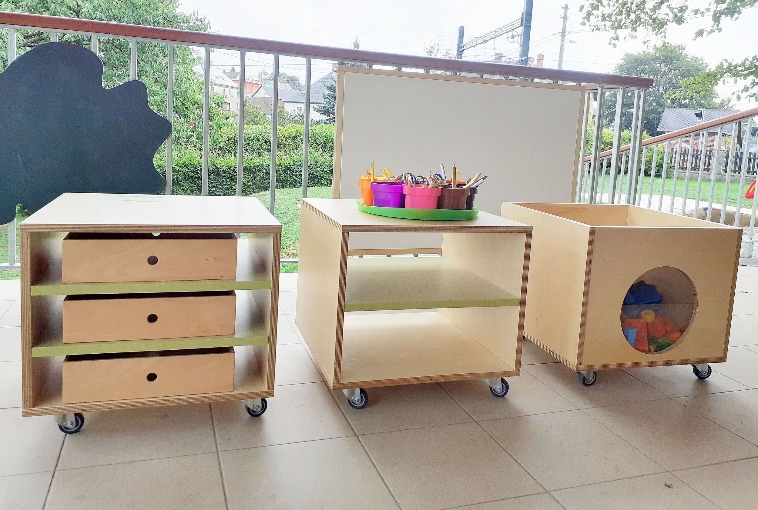 Kabinety na kolečkách dodávají prostoru na variabilitě. Díky nim si děti mohou snadno přizpůsobit uspořádání prostoru podle svých potřeb – mohou si vytvořit malý koutek pro sebe, skupinové zázemí pro týmové aktivity nebo prostor pro větší skupinové hry. Tyto mobilní prvky podporují u dětí pocit autonomie a umožňují jim samostatně rozhodovat o svém okolí.