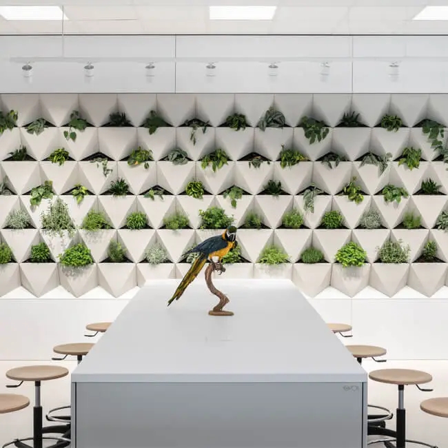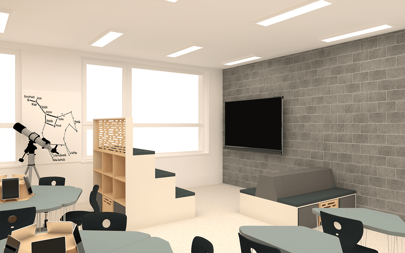 Dominantou učebny je dřevěný úložný box, který slouží jako zázemí pro uskladnění nábytku i školních pomůcek. Jeho čelní plocha je osazena tabulí popisovatelnou křídou. Uvnitř boxu je prostor pro uložení nábytku a školních pomůcek. Boční část nabízí prostor pro pomůcky nebo nářadí a horní plocha je doplněna integrovaným květináčem určeným pro pěstování bylinek či rostlin, které mohou žáci sami opečovávat.