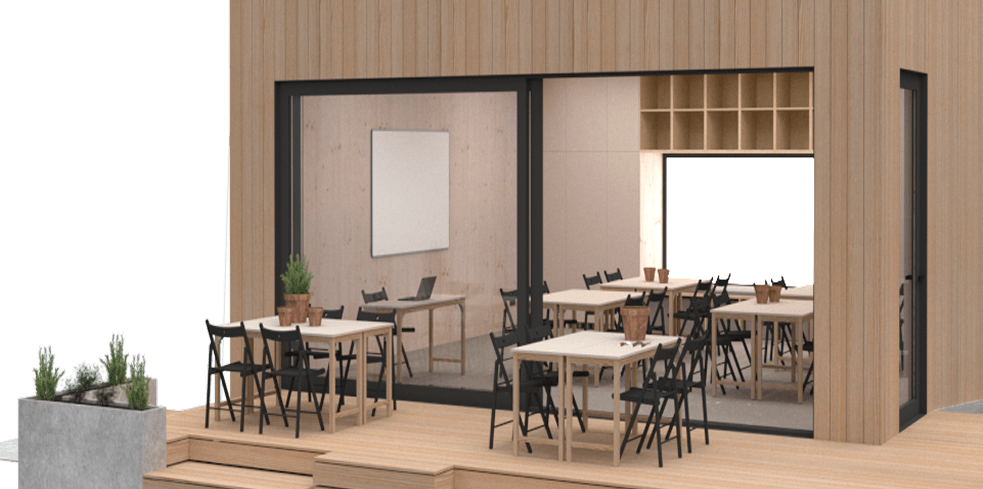 Učebna se rozkládá se na ploše přibližně 9 × 10 metrů. Prostor je vybaven napevno umístěnými stoly vyrobenými z oceli a odolného exotického dřeva. To zajišťuje dlouhou životnost a estetickou hodnotu. Stoličky z recyklovaného plastu v jemně zeleném odstínu jsou lehké, stohovatelné a snadno přemístitelné.
