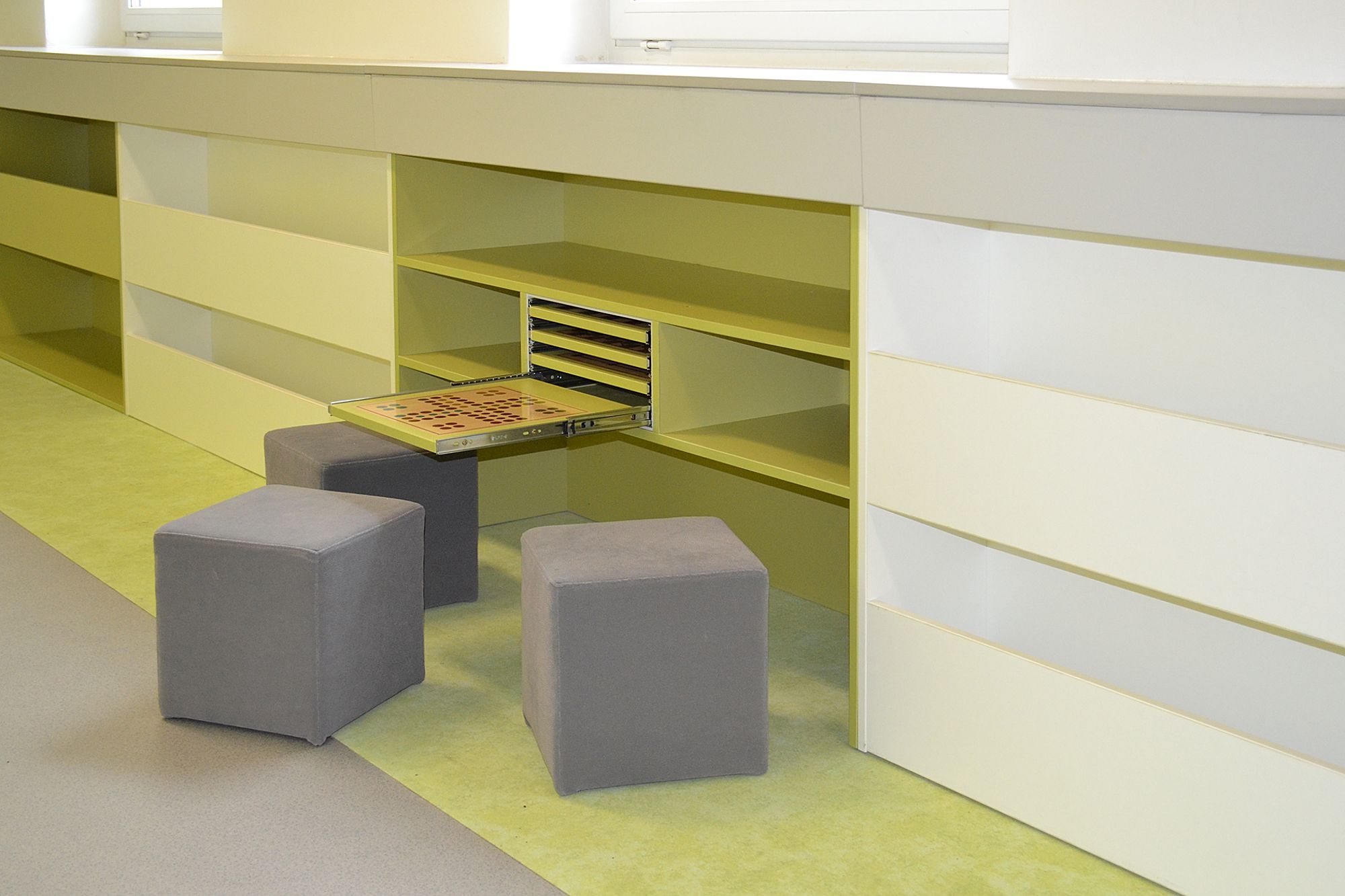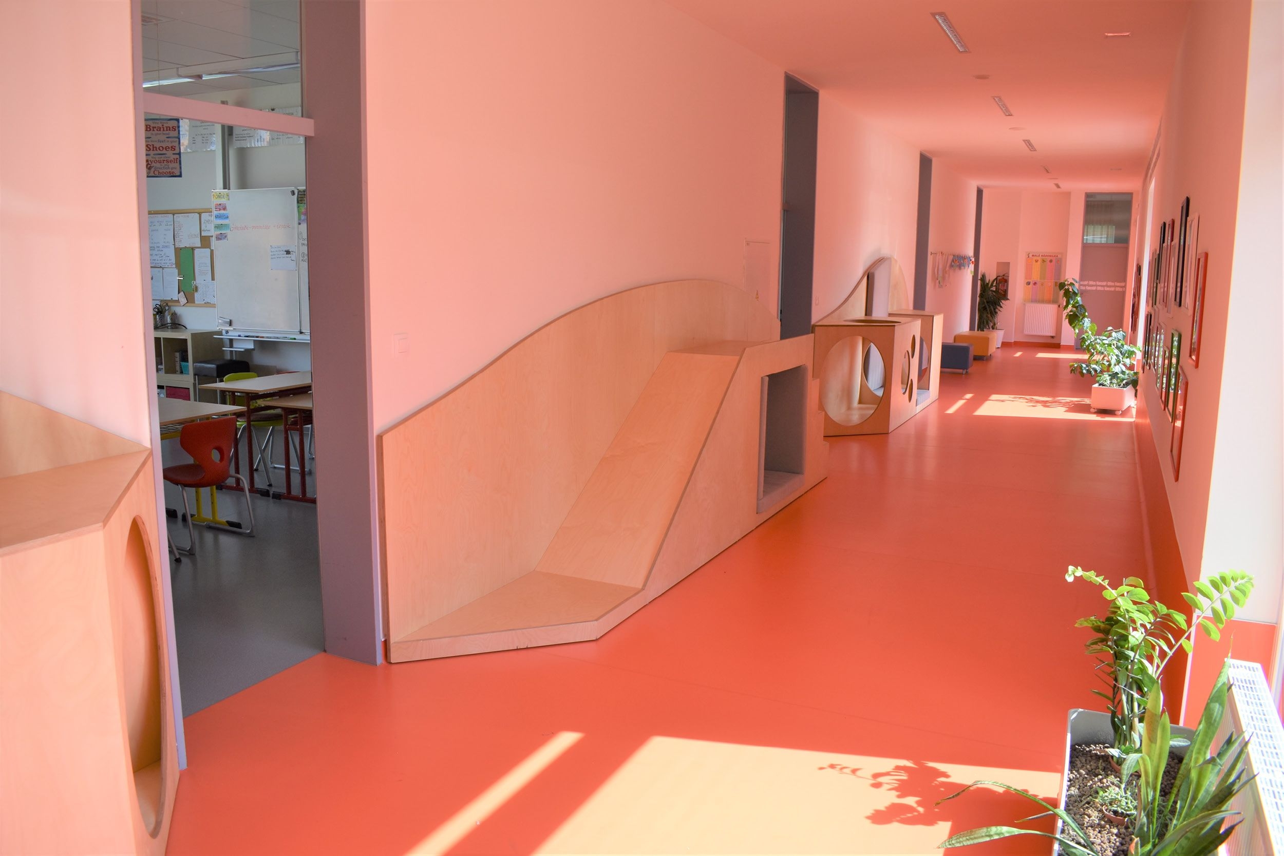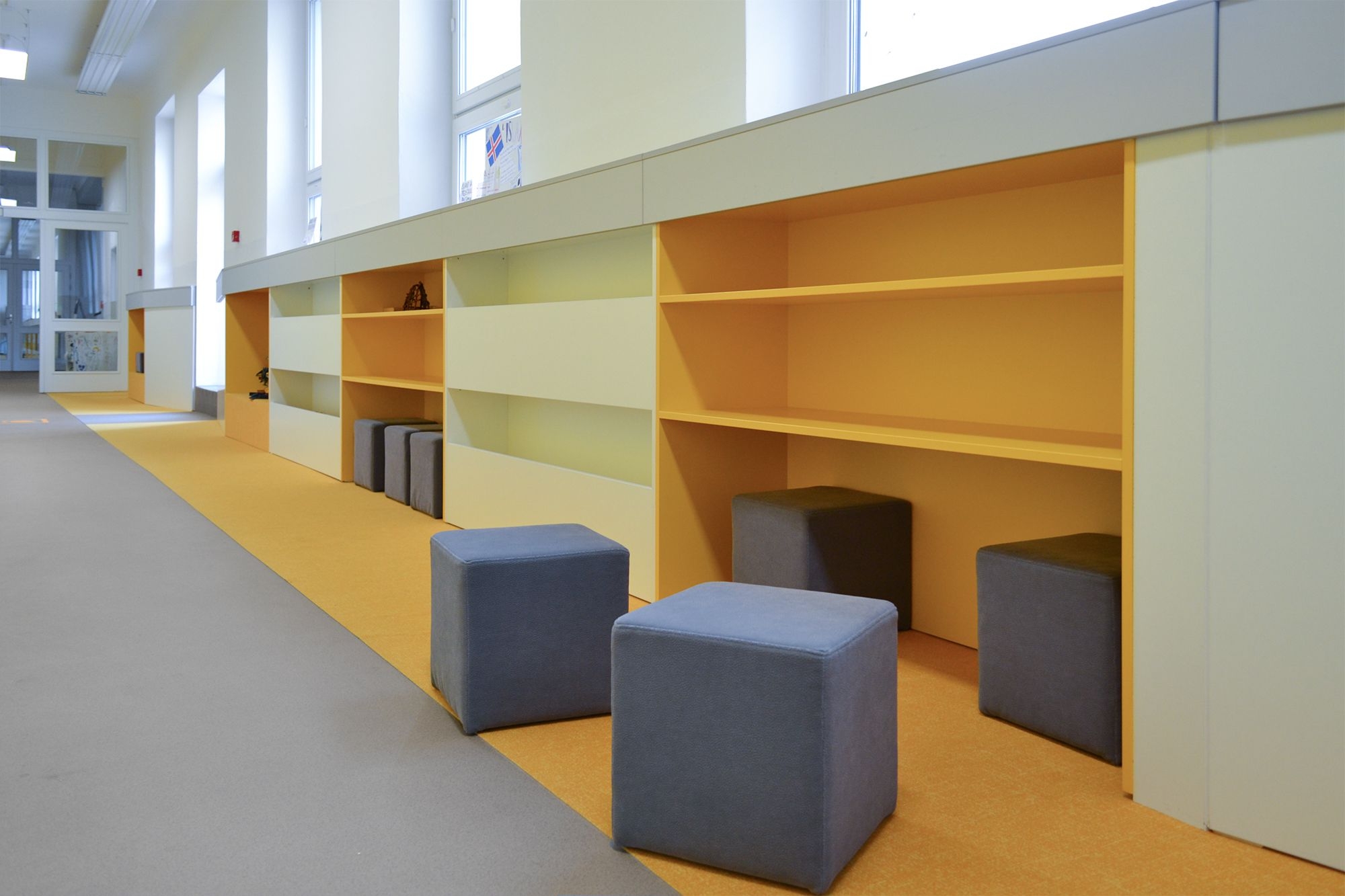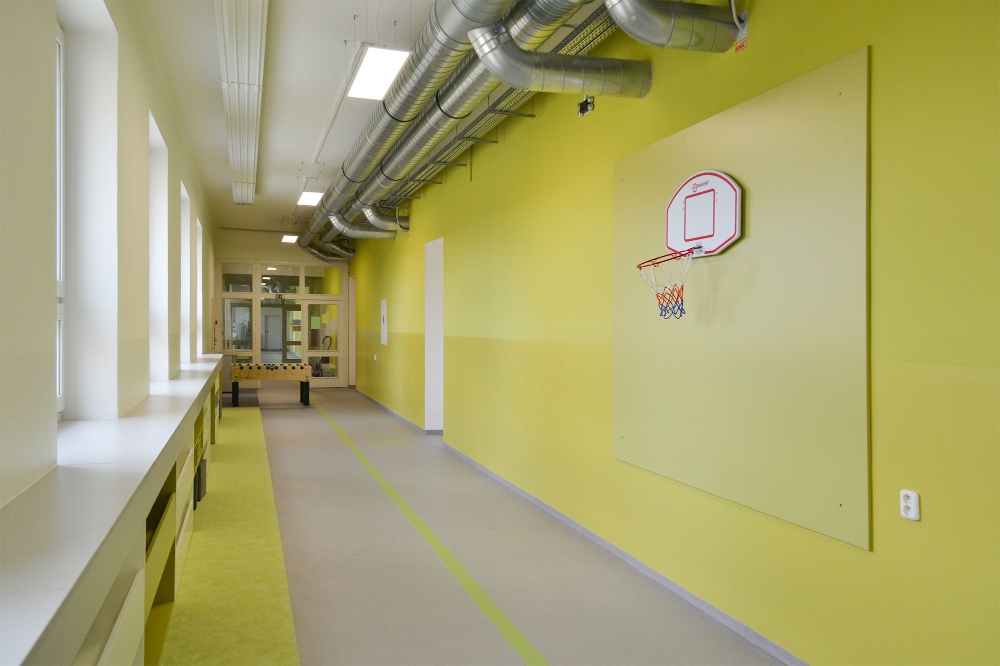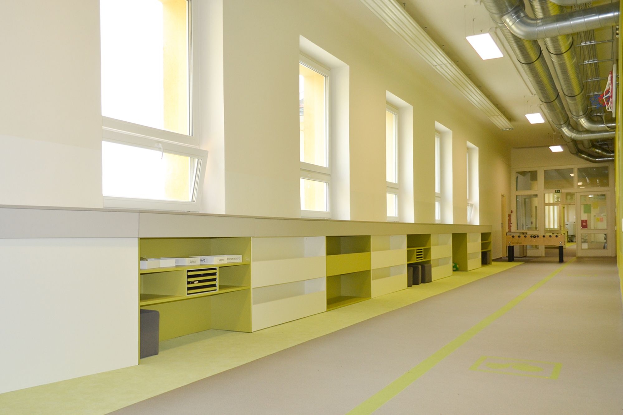 Chodby v přízemí a v prvním patře základní školy jsou nejen komunikacemi, slouží také k odpočinku a zábavě dětí o přestávkách nebo ve volném čase ve škole. Chodba je rozdělena na komunikaci a odpočinkovou zónu. Komunikace je vymezena šedým PVC se zeleným navigačním pruhem a piktogramy u dveří do jednotlivých místností. Pod okny s průběžným parapetem je odpočinková zóna se zeleným kobercem, která je doplněna čalouněnými taburety a herními prvky. V parapetech jsou vestavěny police na hračky, knihy a prostor pro uklizení taburetů.